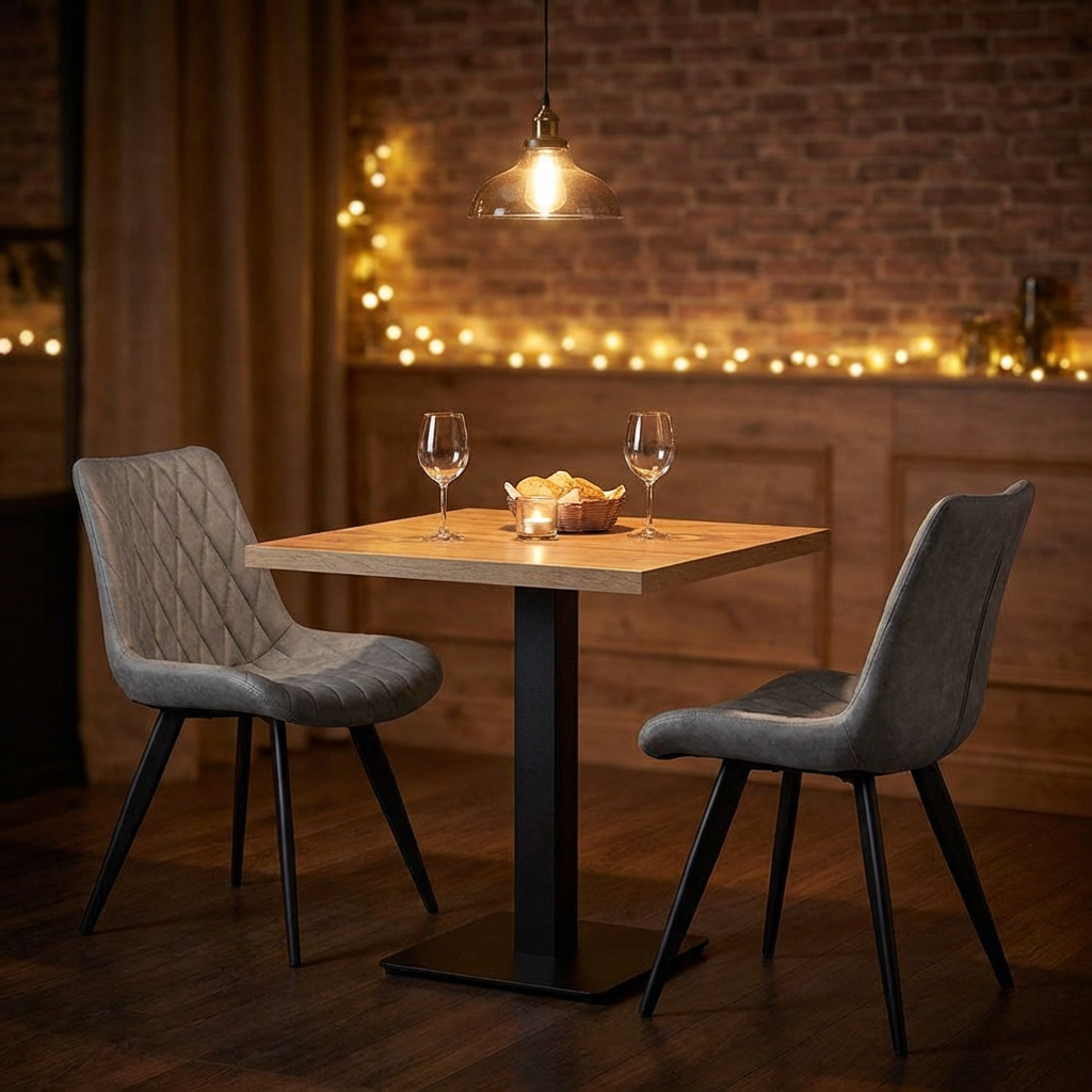 Diese exklusive Restaurant Sitzgruppe vereint Funktionalität, Langlebigkeit und stilvolles Design – ideal für Restaurants, Cafés, Bars oder Hotels. Das Set besteht aus einem robusten Restaurant Tisch Andora in Eiche (50x50 cm) und zwei bequemen Restaurant Stühlen Scarlet in Grau.