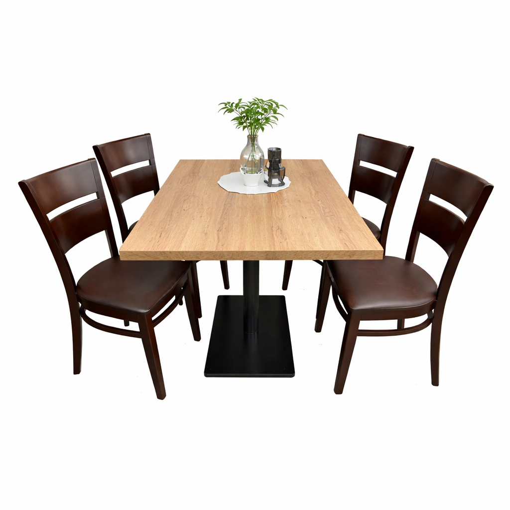 Diese professionelle Restaurant-Sitzgruppe (auch Restaurantgarnitur oder Sitzgruppe genannt) ist die perfekte Lösung für Gastronomie, Restaurant, Bistro, Café, Bar oder Hotel. Die Kombination aus stabilem Tisch mit Gußeisentischbein und vier komfortablen Massivholzstühlen vereint Langlebigkeit, Funktionalität und ein zeitloses Design – ideal für den täglichen, intensiven Einsatz im gewerblichen Bereich.